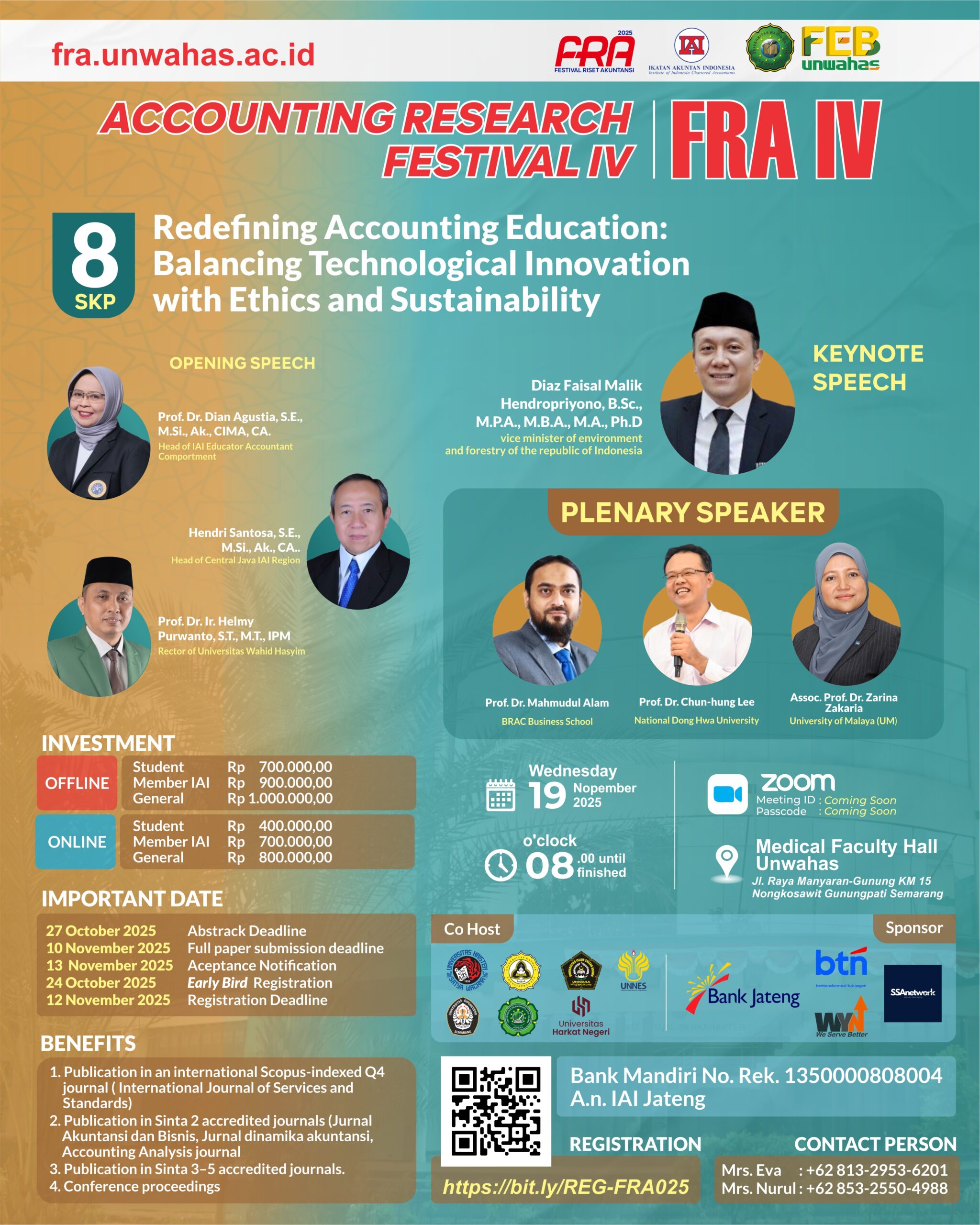 Accounting Research Festival ke-4 (FRA 4) Tahun 2025 adalah forum ilmiah tahunan yang diselenggarakan oleh Ikatan Akuntan Indonesia (IAI) Wilayah Jawa Tengah – Bidang Akuntan Pendidik, dengan Universitas Wahid Hasyim (Unwahas) sebagai tuan rumah.